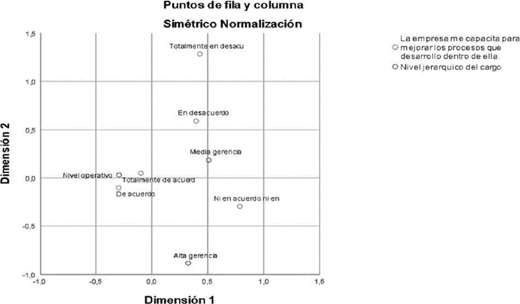 La Tabla 9 determina que entre el nivel jerárquico del cliente interno en la organización y su perspectiva frente a la capacitación recibida en la empresa existe un nivel de explicación de los datos sobre dos dimensiones con una inercia del 100.0% en términos de análisis de correspondencias simples en reducción de dimensiones. En la Figura 6 se observa que los colaboradores que pertenecen al nivel operativo están de acuerdo con afirmar que la empresa los capacita para mejorar los procesos que desarrollan dentro de ella, los que hacen parte de la media gerencia están en desacuerdo con esta afirmación, y los colaboradores que conforman la alta gerencia manifiestan no estar ni de acuerdo ni en desacuerdo con este hecho.
