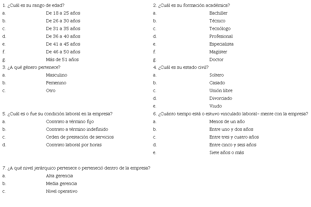 Las edades de los participantes estuvieron entre los 18 a los 52 años. La distribución del género fue de 51.2% mujeres y de un 46.5% hombres. El 5.5% posee una formación de bachillerato básico, el 70.7% técnica y tecnológica y el 23.4% formación profesional y a nivel de especialización un 0.4%. Frente a su condición laboral en la empresa a la que pertenecen el 56.9% posee un contrato laboral a término indefinido, mientras que el 33.5% posee un contrato a término fijo. Finalmente, el 59.7% de la población hace parte del nivel operativo de la organización, el 29.9% a la media gerencia y el 10.4% a la alta gerencia.