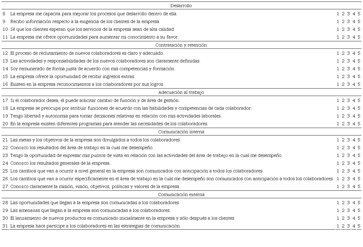 El instrumento para el levantamiento de la información fue una encuesta, construida a partir del modelo de gestión del employer branding propuesto por Fuentes-Jiménez (2009) la cual está dividida en dos partes: la primera presenta siete ítems que tienen como finalidad caracterizar sociodemográficamente a los participantes por medio de preguntas de tipo nominal; la segunda parte presenta veinticuatro ítems que caracterizan el modelo de gestión del employer branding estudiado por medio de preguntas tipo Likert organizadas en cinco dimensiones con sus respectivos factores: desarrollo (capacitación, información del cliente, cliente externo y conocimiento), contratación y retención (reclutamiento, selección, nuevos empleados, pagos extras y reconocimientos), adecuación al trabajo (funciones, habilidades, desarrollo de actividades, necesidades del cliente interno), comunicación interna (metas y objetivos, alcance de resultados, oportunidad de expresión y axiología corporativa) y comunicación externa (la organización en el macroambiente, administración del portafolio de productos y protagonismo en los medios).