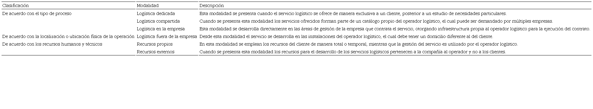 Es relevante resaltar cómo, desde las actividades logísticas estos operadores pueden presentar diferentes tipos de modalidades de servicios; al respecto, dichas modalidades se presentan en la Tabla 1.