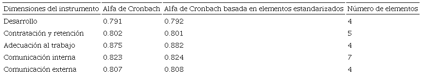 El levantamiento de la información se llevó a cabo en el primer trimestre del año 2019 y la validación del instrumento se desarrolló con una prueba piloto del 10% de la muestra a través de la prueba Alfa de Cronbach obteniendo resultados satisfactorios para cada una de sus dimensiones tal como lo plasma la Tabla 2. Este análisis estadístico se desarrolló utilizando el paquete estadístico SPSS versión 25.0.