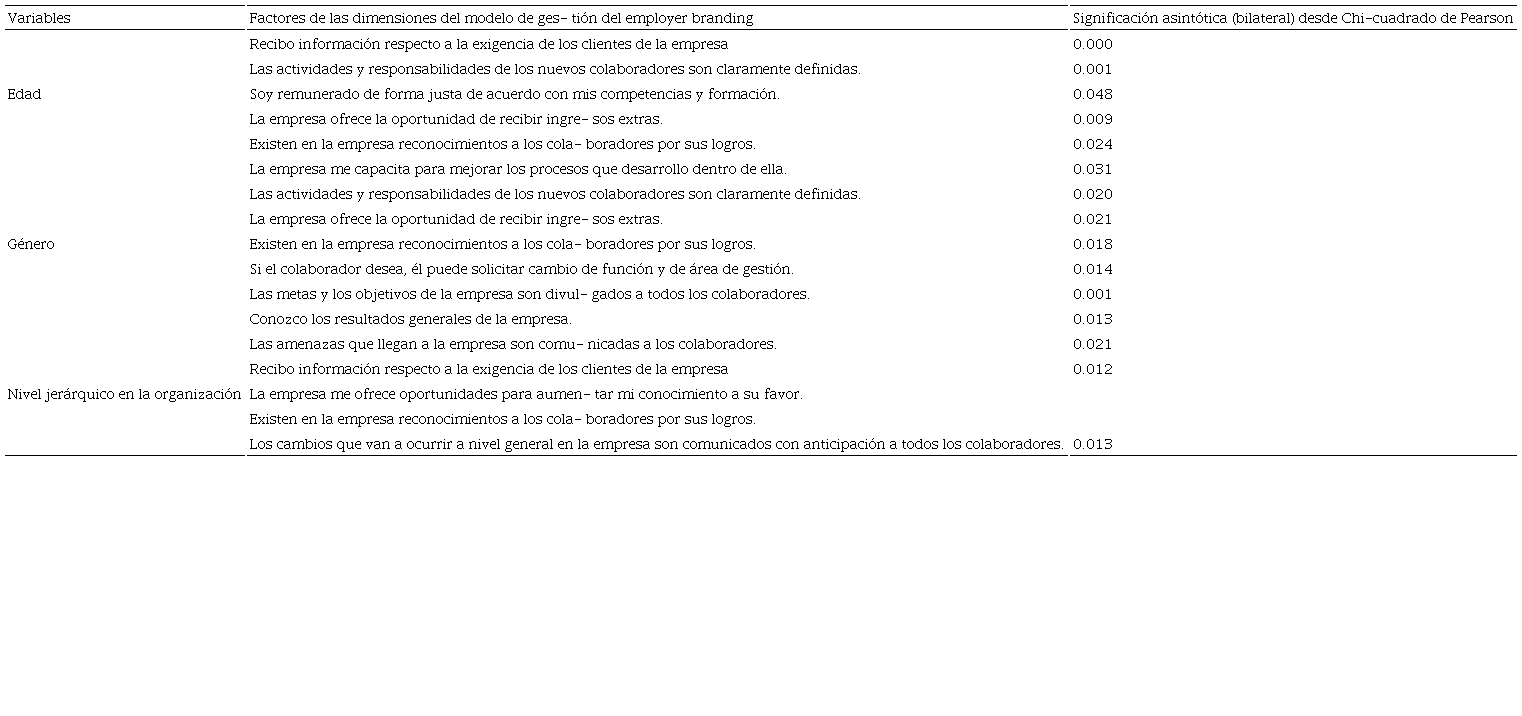 Se identificaron los factores de las dimensiones del modelo de gestión del employer branding (Fuentes-Jiménez, 2009) con los cuales existe un significativo nivel de asociación con la edad, el género y el nivel jerárquico al interior de las organizaciones de la población estudiada, esto sustentado por Horstmanny y Martín (2017) cuando afirman que el nuevo milenio se caracteriza por la escasez del talento, el cual implica desafíos organizacionales en los procesos de reclutamiento y selección debido a los factores sociodemográficos del mercado laboral. Teniendo en cuenta que la significación asintótica (bilateral) desde Chi-cuadrado de Pearson en los factores de las dimensiones encontradas son inferiores a 0.05 se rechaza la hipótesis nula y a su vez se acepta la hipótesis alternativa, encontrando relaciones significativas a un nivel del 95% de confiabilidad y un 5% de error (Páramo-Morales, 2015). Dichas asociaciones se observan en la Tabla 3.