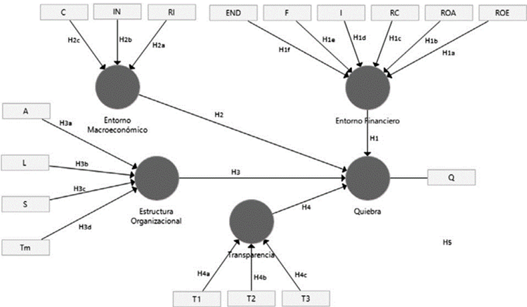 Finalmente, la hipótesis H5 donde se plantea que los constructos Entorno Financiero, Entorno Macroeconómico, Estructura Organizacional, y la Transparencia, tienen influencia en la quiebra empresarial fue validada, con lo cual se da continuidad a la propuesta planteada por Rodríguez et al. (2017), adicionalmente, se deja abierta la posibilidad de que el modelo sea replicado en otras economías, con el objeto de ver la influencia de cada uno de estos constructos en el evento.