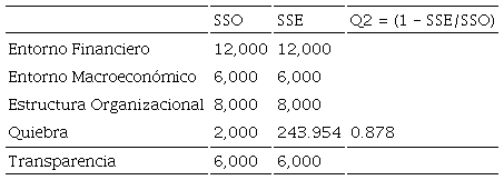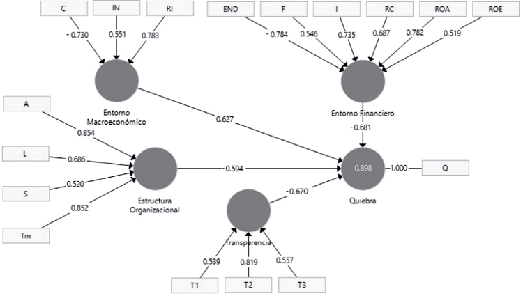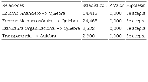 Hipótesis 5: El Entorno Financiero, el Entorno Macroeconómico, la Estructura Organiza-cional, y la Transparencia, tienen influencia en la quiebra empresarial. Lo anterior, dado que todos los constructos resultaron estadísticamente significativos frente a la quiebra empresarial con un nivel estadístico de significancia del 95%, adicionalmente, al seguir con el proceso de verificación de las pruebas restantes para validar el Modelo de Ecuaciones Estructurales (MES) de tipo formativo, se encontró la validez del modelo en su conjunto.