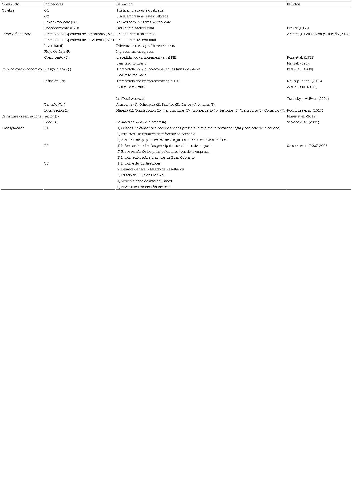 La muestra de empresas fue estructurada con base en el informe del 31 de diciembre del 2016 presentado por Supersociedades y que comprende el período de 1997 al 2016, bajo las modalidades de Reorganización y Validación, Liquidación Obligatoria, Liquidación Judicial, concordato y Reestructuración. El informe proporciona datos como el número de identificación tributaria (NIT), razón social, ciudad, sector, tamaño, estados financieros, fecha de inicio y cierre del proceso, entre otros. La Tabla 1 muestra los indicadores para cada constructo, al igual que sus definiciones y estudios que respaldan la escogencia de los mismos.