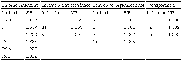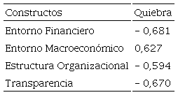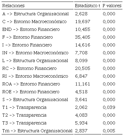 Sobre el modelo se destaca que todos los constructos considerados en la parte teórica (Entorno Financiero, Entorno Macroeconómico, Estructura Organizacional y Transparencia) se mantuvieron luego de los diferentes análisis estadísticos requeridos en la validación de un Modelo de Ecuaciones Estructurales (MES) de tipo formativo.