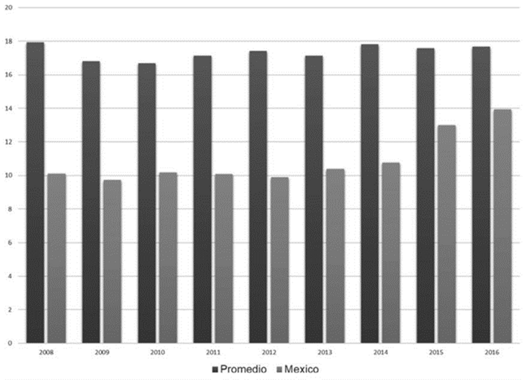En México existen pocos temas en los que la gran mayoría de los economistas pueden estar de acuerdo, uno de ellos es el pobre desempeño que tiene el país en materia de recaudación. No importa qué criterio o comparativa se use, el resultado siempre apunta en la misma dirección. La Figura 1, ofrece información sobre la recaudación en relación con el PIB para los años de 2008 a 2016 del país, así como el promedio de un grupo importante de países a lo largo del mundo para los cuales reporta información el Banco Mundial. Hasta el año 2012 parecía que la recaudación había caído en una trampa que le impedía superar la barrera del 10%.