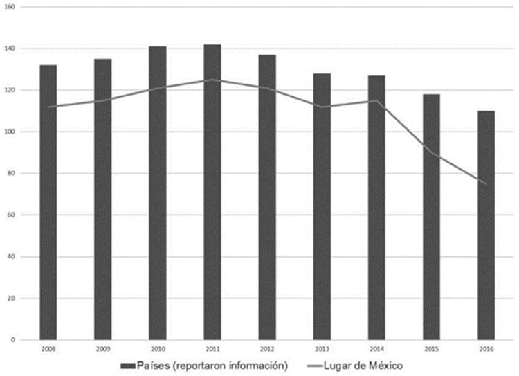 La obligatoriedad de los pagos referenciados a diferencia de las otras medidas llevadas a cabo tuvo la virtud de romper con la trampa del 10%, como se puede apreciar en la Figura 1. Para dar una idea sobre el avance que tuvo el país en relación con otras economías en la Figura 2 se presenta en las barras, la cantidad de países que presentaron información de su recaudación en relación con el PIB y en la línea, el lugar que ocupaba México de acuerdo con su recaudación. Como puede apreciarse, en 2012 de 137 países México ocupaba el lugar 121, en 2016 de 110 países ocupaba el lugar 75.