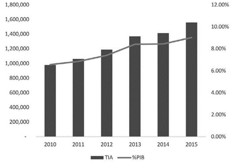 Los ingresos acumulables de este segmento de contribuyentes representaban en 2010 alrededor del 6.6% del PIB y se fueron incrementando a lo largo del periodo para llegar a poco más de 9% en 2015 (Figura 3). ¿Qué es lo que explica el comportamiento de la TIA? Para algunos años se puede explicar por el dinamismo de la economía, pero para todo el periodo la explicación tiene que ver con el incremento de padrón de contribuyentes, que se hace evidente por el aumento de las declaraciones presentadas y por supuesto de los registros analizados en el presente trabajo, de 2010 a 2015 los registros analizados se incrementaron en 105%, mientras que la TIA en el periodo lo hizo cerca del 60% y el PIB cerca del 16%. Para el año 2013 se da un incremento importante en los registros analizados que es posible asociar con un programa de regularización de adeudos fiscales denominado “ponte al corriente”.