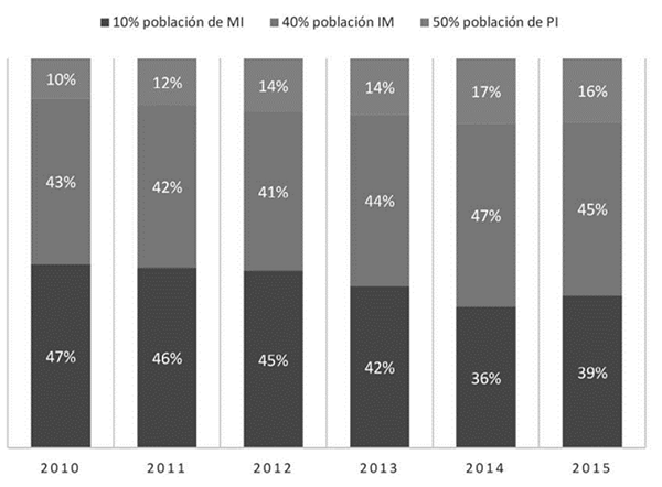 La concentración del ingreso a lo largo del periodo se fue moderando pero en 2015 se revirtió la tendencia, no obstante, se avanzó en reducir la concentración ya que en ese año el 10% de la población de mejor ingreso concentraba el 43%, 7 puntos porcentuales menos que en 2010, el 50% de la población se apoderó de 5% más del ingreso en comparación con el 2010, mientras que el 40% de ingresos medios lo hizo en un 2% (Figura 5).