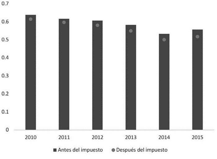 En el periodo de 2013 a 2015, después del impuesto se logró un mayor impacto en la participación del 10% de la población de mejores ingresos y una mejor participación del 50% de la población de menores ingresos. Dado lo anterior se podría inferir que el impuesto ha tenido cierta capacidad de redistribución por lo menos en la población y los años de estudio, aun cuando siguen siendo cambios marginales.