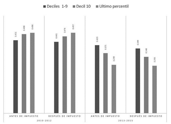 Al descomponer el coeficiente de Gini para cada decil, la más amplia concentración del ingreso se encuentra en los deciles extremos y particularmente es mayor en el décimo decil correspondiente al 10% de la población con mejores ingresos, mientras que el séptimo decil es el que presenta la menor concentración. En los años de 2010 a 2012 el impuesto tuvo una mínima incidencia en modificar esa situación. Sin embargo, es importante denotar que en los años 2013 a 2015 el impuesto tuvo incidencia favorable en reducir la concentración en el décimo decil, pero su impacto en el último percentil es ínfimo.