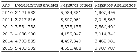 De acuerdo con el Reporte anual 2015 y Retos 2016 presentado por el SAT (2015b) en 2015 el número de declaraciones presentadas fue de 5.4 millones, sin embargo, en la base de datos anonimizada se presentan tan sólo 4.7 millones de registros correspondientes a igual número de declaraciones, lo cual puede ser explicado por la depuración comentada anteriormente, en cada uno de los seis años analizados las cifras tienen esa particularidad, como se puede apreciar en el Tabla 1.