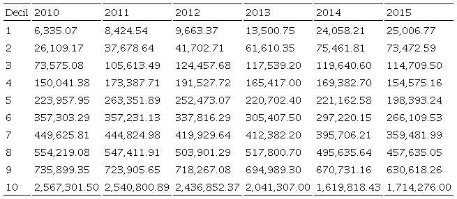En la Tabla 3 se muestra la renta tributaria promedio a precios de 2013, concepto que se refiere al impuesto causado por los contribuyentes. Comparando los extremos, es decir, el decil 10 y el 1, es posible percibir que la brecha entre ellos es amplia siendo mucho mayor al observado por la TIA promedio, en 2010 la renta tributaria promedio del decil 10 es 3,437 veces mayor que la del decil 1, mientras que en 2015 la relación fue de 374 veces.