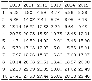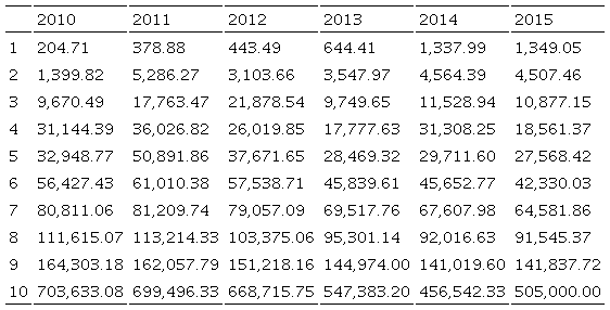 De la base de datos compuesta por 45 variables, dos particularmente son relevantes para el presente estudio y corresponden al “Total de Ingresos Acumulables” (TIA) y el “Impuestos Sobre la Renta Causado” (ISRC), con base en ellas se pretende establecer la distribución del ingreso y el efecto distributivo que tiene el impuesto. Para tal propósito se realizó una nueva depuración de las series eliminando aquellos registros en los que la TIA era cero o no contenía información o bien en los casos en que no se registró impuesto causado. Una vez realizada dicha depuración de la totalidad de las declaraciones se analizó para el año 2010 tan sólo el 62%, porcentaje que fue aumentando a lo largo del periodo llegando al 84% para el año 2015, como se reporta en la Tabla 1. Es importante mencionar que dada la eliminación de los registros se tuvieron cambios marginales en los resultados, aun cuando las tendencias se mantuvieron en lo general.
