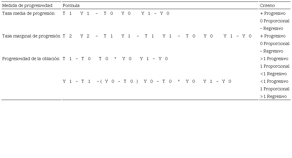 Musgrave y Thin (1948) exponen cuatro maneras diferentes de obtener el grado de progresividad que se muestran en la Tabla 5, las dos primeras derivadas de los Planteamientos de Pigou, la tercera en relación con la elasticidad de la renta tributaria sobre el ingreso y la última una derivación de la tercera.