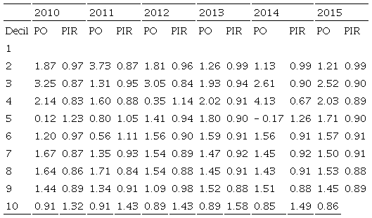 Respecto al PIR, como se veía en la Tabla 6 cambia su interpretación y será progresivo en los casos en que sea menor a 1 y regresivo cuando sea mayor, siendo proporcional en 1. Tanto el PO como el PIR no tienen diferencias al detectar cambios que se dan de progresivo a regresivo o viceversa, pero su interpretación cambia en relación con qué tan progresivo es el cobro del impuesto. Para muestra en el año 2015, mientras pasar del decil 2 al 3 implica un PO de 2.52 y un PIR de 0.90, pasar del decil 4 al 5 implicaría un PO de 1.71 y un PIR de 0.90 lo cual puede generar una idea errónea al respecto de la progresividad.