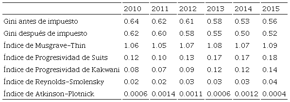 Uno de los índices más usuales es el conocido índice de Progresividad de Kakwani (1977) que consiste en considerar el índice de concentración del impuesto y el coeficiente de Gini antes de impuestos, un valor positivo del índice indica un sistema tributario progresivo y un valor negativo indicará un sistema regresivo. Como se puede apreciar en la Tabla 7, el Índice de Kakwani es positivo en todos los años y se ha incrementado con el tiempo, aun cuando su progresividad es ligera8.