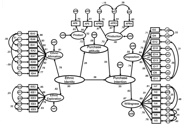 After, a second-order CFA was performed to integrate the components obtained into second-order constructs. A structure of three factors of second order (ethnic identity, purchase attitude and purchase intention) was obtained from 34 items; during the process, two questions of the attitude towards production component and one question of the attitude towards the product component were eliminated. The CFA showed a proper model fit with a GFI of 0.881, SRMR = 0.050, RMSEA = 0.048, CFI = 0.962, CMIN / DF = 1.922 and PRATIO = 0.893.