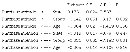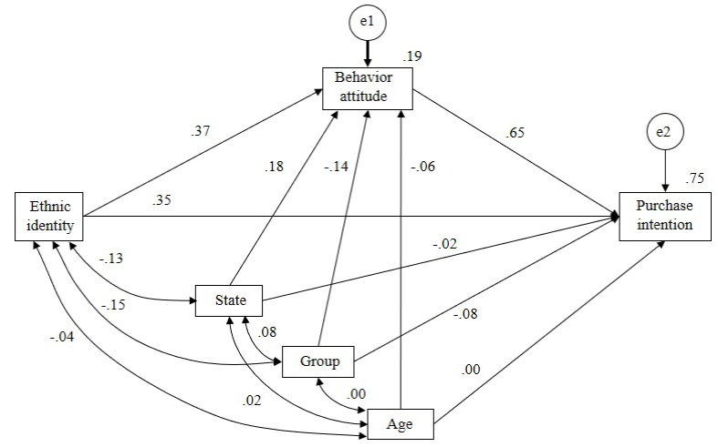 Moreover, to avoid the spurious effect of demographic variables, such as place of origin, age, and ethnic group of the consumer, the purchase intention model analyzed the influence of demographic variables State -which indicated if the interviewee came from a state producing ethnic textiles-, age and group, to measure as a control variable if the consumer belonged to an ethnic group and in that case, if this had an influence on the model. As shown in Figure 3 and Table 4, the demographic variable State (0.176, p = 0.001) is the only one that showed influence in the model as a control variable. Besides, neither age nor ethnic group membership was significant as control variables in the model.