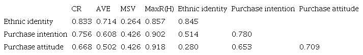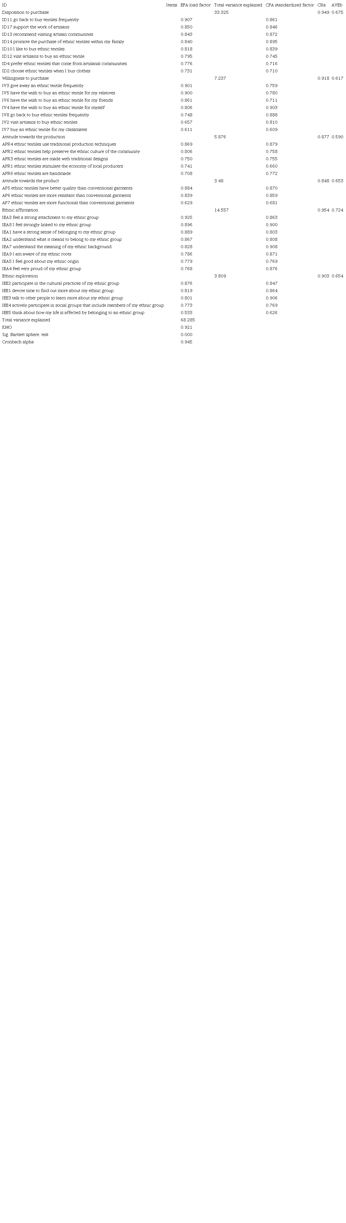 The internal validity of the scales was an exploratory factor analysis (EFA) using the maximum likelihood technique with Promax Rotation and Kaiser Normalization to reduce the dimensions. The items selected were factor loadings ≥0.5. For reliability using Cronbach’s alpha. Kaiser-Meyer-Olkin (KMO) and the Bartlett sphericity were tested for sampling adequacy to determine the relevance of the factor analysis. There were six components labeled: disposition to purchase (Factor 1), willingness to purchase (Factor 2), attitude towards the production (Factor 3), attitude towards the product (Factor 4), ethnic affirmation (Factor 5) and ethnic exploration (Factor 6). The total variance explained was 68.285%, with a KMO of 0.921 and a Cronbach alpha of 0.945. The Bartlett test result was statistically significant (Chi-square=13124.50; p=0.000) (Table 1). The six components used to explain the research model proposed in this research were valid and reliable for the following inferential analyzes.