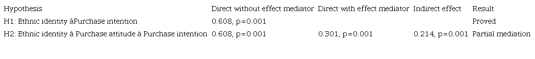 To test H2, which proposed that behavioral attitude mediates the relationship between ethnic identity and intention to purchase ethnic textiles of the middle-class consumers, the indirect effect of ethnic identity was measured using the bootstrapping method proposed by Hayes (2009) and 2000 bootstrap samples were obtained by resampling. This method is more persuasive than the causal step approach proposed by Baron and Kenny (1986). The presence of the behavioral attitude as a mediating variable between the ethnic identity and the purchase intention had a coefficient of 0.301 and was statistically significant (p = 0.001); an indirect effect coefficient of 0.214 was also significant (p = 0.001). Therefore, the mediation is partially proved (Table 3) because the coefficient of the direct effect of ethnic identity on the purchase intention without the presence of the attitude, is higher than the coefficient of the indirect effect between the ethnic identity and the purchase intention with the presence of the attitude as mediator (0.608, p = 0.001). Thus, hypothesis 2 is partially proved.