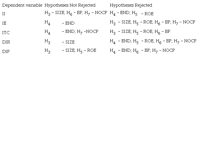 Table 10 is a summary of the rejected and non-rejected hypotheses based on the logistic regressions in Table 9.