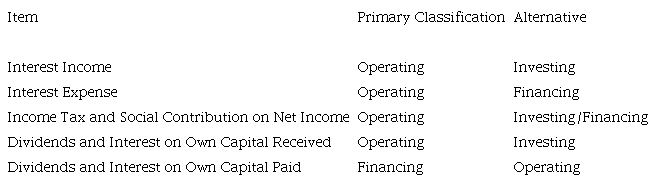 IAS 7 (2010) states that cash flows related to interest, dividends and interest on own capital paid and dividends and interest on own capital received must be disclosed separately and presented consistently under investing, financing or operating activities. IAS 7 (2010) also states that cash flows related to income tax and social contribution on net income should be presented separately and classified within the operating group. Nevertheless, it is still also possible to associate these cash flows with other activities (investment or financing). Table 1 shows the classification possibilities (primary and alternative) for SCF items according to IAS 7. The IASB strongly encourages primary classification for these items, but if practicable, the alternative classification may be adopted as long as an explanatory note indicates it.