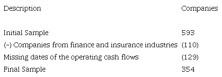 The research sample consisted of Brazilian public companies listed on BM&FBOVESPA from 2010 to 2015, except those in the finance and insurance industries and companies with missing dates of the operating cash flows (Table 2). Financial and insurance companies were excluded because their classification of interest is distinct from that of companies in other industries. Thus, the valid sample size was 354 Brazilian public companies. The financial statements of these companies were obtained from the Brazilian Securities Commission (CVM - Comissão de Valores Mobiliários) website.