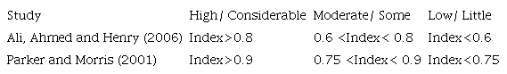 The H index uses all the elements introduced in this equation to generate a value that represents the level of comparability of the practices evaluated. Lemes, Costa, and Martins (2014) state that researchers must use judgment to interpret this comparability value as high, moderate or low. Taplin (2011) highlights the difficulty of evaluating harmony due to the lack of benchmarks, but notes that this criticism extends to all indices and statistical summaries. The author cites the traditional benchmark for the p-value (0.05). This value is accepted by convention but not universally accepted as appropriate in all areas. Table 3 summarizes some of the parameters used to classify comparability.