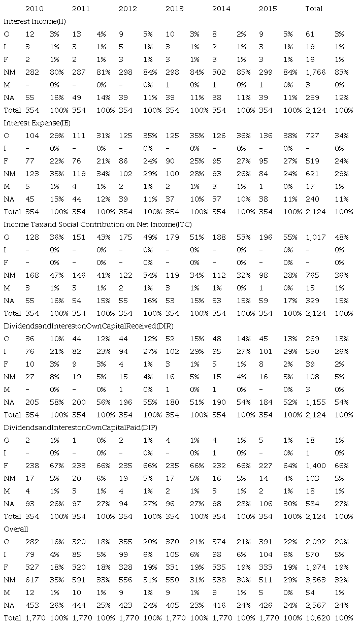 Table 6 shows that, in general, given the time horizon of the study, the comparability level was high for interest income (II = 90%), moderate for dividends and interest on own capital paid (DIP = 83%) and low for interest expense (IE = 33%), income tax and social contribution (ITC = 50%) and dividends and interest on own capital received (DIR = 41%).