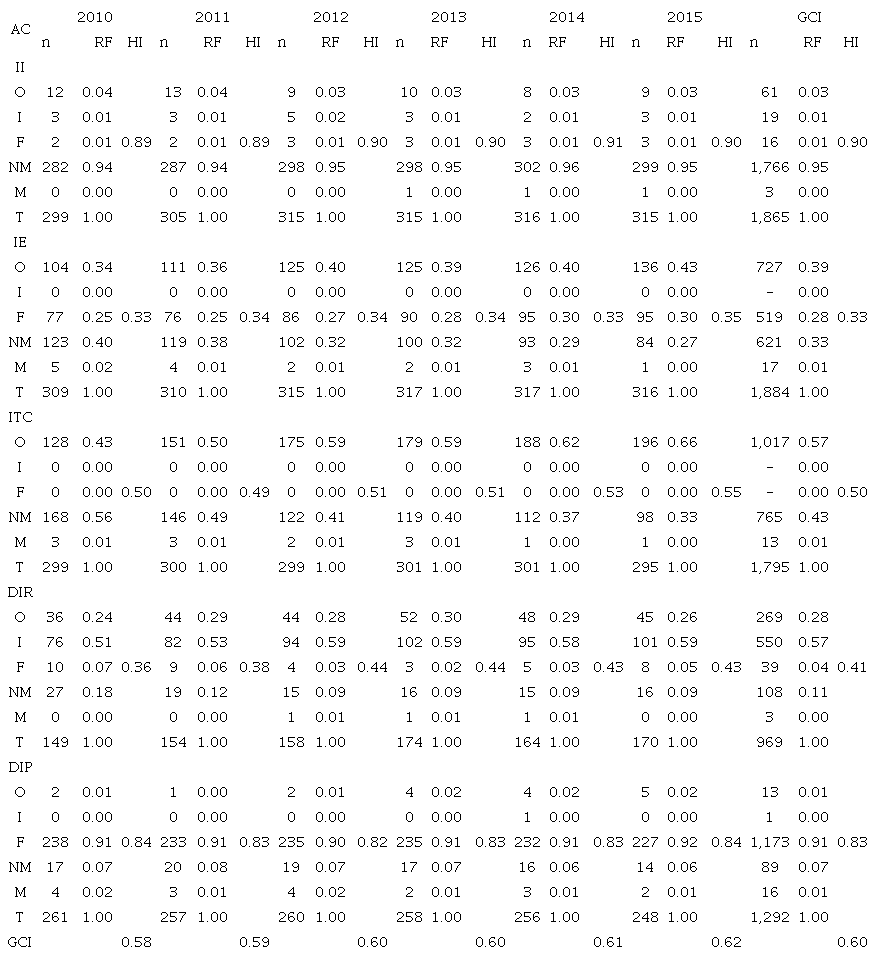 The comparability level of interest expense (IE) was lower in each of the years analyzed (0.33, 0.34, 0.34, 0.34, 0.33 e 0.35, respectively). Most of the companies classified interest expense under operating cash flows. Nevertheless, this classification is disperse. The index of comparability was also low for income tax and social contribution (ITC) from 2010 until 2015 (0.50, 0.49, 0.51, 0.51, 0.53 and 0.55, respectively). Most of the companies classified this item under operating activities, but many companies did not mention (NM) the classification of these items in the SCF.