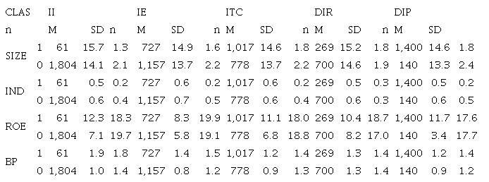 Table 7 shows that the mean SIZE is higher for the group that chose to classify interest income (II), interest expense (IE), ITC and DIR in the operating activities (dummy = 1). The same occurred with DIP, the average SIZE is higher for those companies that chose to classify this item in financing activities (dummy = 1). The mean test in Table 8 confirms these results, which that the company size may affect the choice of classification of these items in the Statement of Cash Flows.