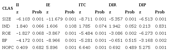 In the same way, size (SIZE), profitability (ROE), book-to-price (BP) and negative cash flows from operating activities (NOPC) may affect the classification choice for taxes on income tax and social contribution (95% confidence level), but indebtedness (IND) can only determine this classification with a 90% confidence level.