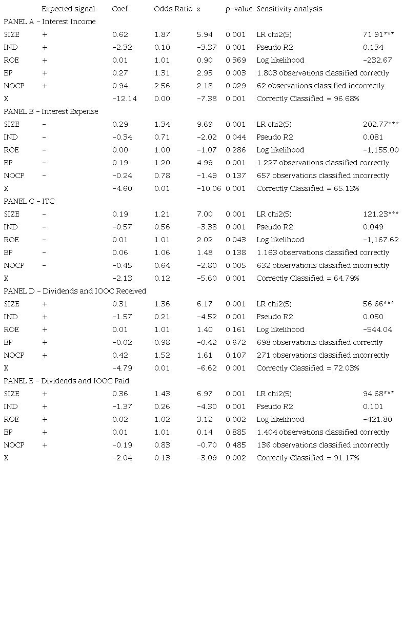 Size (SIZE) and profitability (ROE) may affect the classification choice for dividends and IOOC received (95% confidence level), but indebtedness (IND) can only determine this classification with a 90% confidence level. Whereas size (SIZE), profitability (ROE), growth opportunities (BP, book-to-price) and negative cash flows from operating activities (NOPC) can affect the classification of dividends and interest on own capital paid.