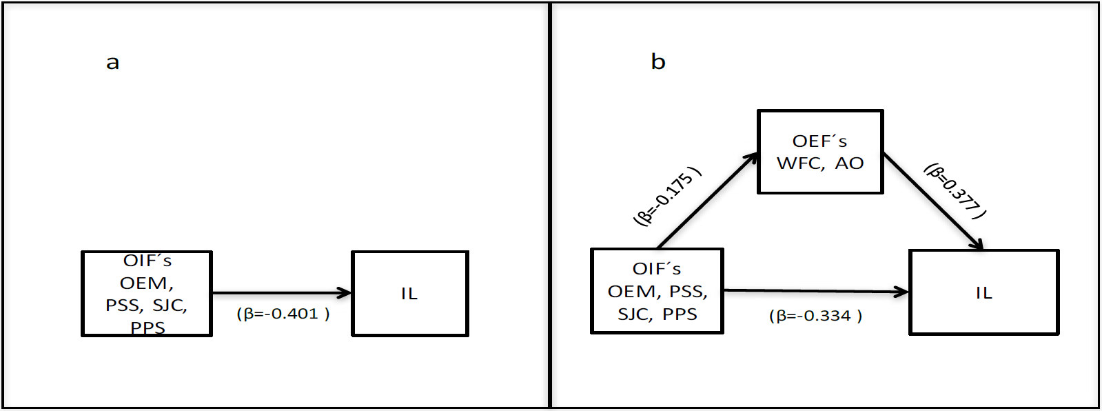 La hipótesis 3 fue probada mediante el análisis de los efectos mediadores. Para probar el efecto mediador de los OEF´s sobre la relación entre los OIF´s y las IL´s fueron usadas las escalas sumadas de los componentes de los OIF´s y de los componentes de los OEF´s combinando los 33 ítems para conformar las 2 variables (24 ítems de OIF´s y 9 de OEF´s). El efecto mediador de los OEF´s entre la relación de los OIF´s y las IL´s fue revisado en 4 etapas, tal como lo propusieron Baron & Kenny (1986), donde la prueba general para la mediación es demostrar en primera instancia la relación entre la variable independiente (OIF´s) y la variable dependiente (IL), en segundo lugar probar la relación entre la variable predictora (OIF´s) y la variable mediadora (OEF´s), en tercer lugar probar la relación entre la variable mediadora (OEF´s) y la variable dependiente (IL). Por último, observar que la relación entre la variable independiente (OIF´s) y la variable dependiente (IL) se haya reducido después de haber introducido la variable mediadora (OEF´s).