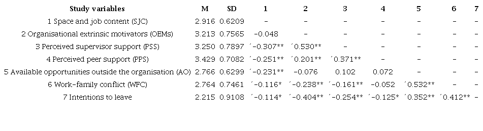 Las medias, desviaciones estándar y correlaciones bivariadas entre las variables del estudio se presentan en la Tabla 1. La muestra de los empleados del hotel refleja una calificación ligeramente por debajo de la puntuación neutral en SJC (M = 2.916), las AO (M = 2.766 ), el WFC (M = 2.764), y las IL (M = 2.215) y levemente por encima de la calificación neutral los OEM (M = 3.213), el PSS (M = 3.250), y el PPS (M = 3.429). Las pruebas t de muestras independientes no revelaron diferencias entre los empleados de ambos sexos y con respecto a las variables del estudio. Como era de esperar, las AO (r = 0.352; p <0.01) y el WFC (r = 0.412; p <0.01) resultaron estar positivamente relacionadas con las IL. El SJC (r = - 0.114; p <0.05), los OEM (r = - 0.404; p <0.01), el PSS (r = - 0.254; p <0.01), y la PPS (r = - 0.125; p <0.05) se relacionaron negativamente con las IL.