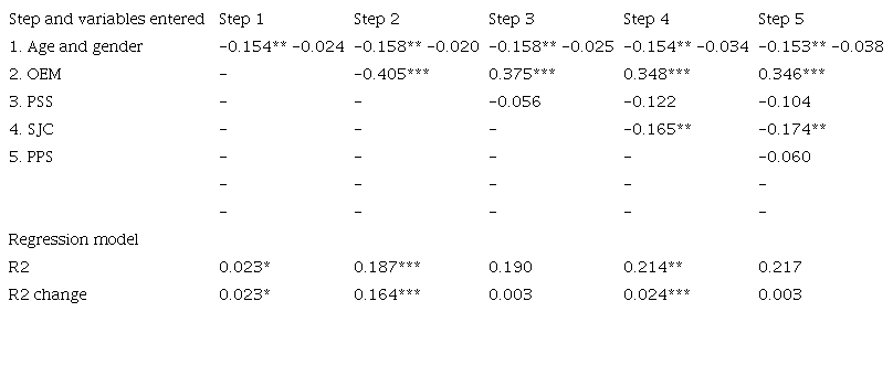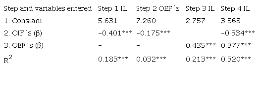 Para comprobar la primera hipótesis se realizó un análisis de regresión lineal jerárquica por pasos con IL como variable de resultado, utilizando como variables de control a la edad y el género. La matriz de regresión indica y corrobora una relación negativa entre todos los OIF´s y las IL´s, por lo que se confirma la hipótesis 1. Como se muestra en la tabla 2, el modelo incluyó 4 OIF´s explicando cerca del 22% de la varianza en IL, F = 4.923; p < 0.001. Sin embargo, de los 4 OIF´s solo 2 se encontraron significativos (OEM b = - 0.346 p < 0.001; SJC b = - 0.174 p < 0.01). Por lo que, los OEM y los SJC surgen como los más influyentes para explicar las IL´s, soportando las hipótesis 1a y 1d.
