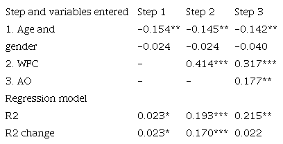 Para comprobar la hipótesis 2 se realizó el mismo procedimiento de análisis de regresión con la IL como variable de resultado, pero considerando los OEF´s como variables independientes y con las mismas variables de control. La matriz de regresión indica una relación positiva entre todos los OEF´s (WFC, AO) y las IL´s, por lo que se confirma la hipótesis 2. Como se muestra en la tabla 3, el modelo incluyó 2 OEF´s explicando el 21.5% de la varianza en IL, F = 20.522; p < 0.01. Los 2 OEF´s se encontraron significativos (WFC β = 0.317 p < 0.001; AO β = 0.177 p < 0.01). Por lo que, los 2 OEF´S resultaron ser predictores de las intenciones de salida, soportando las hipótesis 2a y 2b.