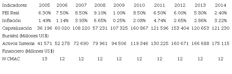 El sistema financiero regulado por la Superintendencia de Banca y Seguros y Administradoras de Fondos de Pensiones (SBS) abarca los sistemas de pensiones, seguros y de intermediación financiera en el Perú. Como se puede apreciar en la Tabla 1 los activos del sistema financiero han evolucionado de una manera creciente en todo el período de análisis. En el año 2005 los activos del sistema fueron de US $ 41 571 millones y en el año 2014 fueron de US $175 115 millones lo que representó un incremento de los activos de 321,24 %. Estos datos confirman que en el Perú el sistema financiero es más importante que la bolsa de valores como fuente de financiamiento para los agentes económicos. Además, el crecimiento sostenido del nivel de los activos demostró que la crisis financiera internacional no afecto al sistema financiero peruano.