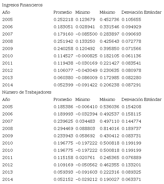 La Tabla 2 muestra los estadísticos descriptivos del crecimiento económico, medido a través de los ingresos financieros y de los trabajadores de las CMAC en el período 2005-2014. Los ingresos financieros promedios en general han crecido, pero con dos etapas claramente establecidas. En el período 2005-2011 el incremento de los ingresos financieros ha sido variable, pero con elevado crecimiento sobre todo en los años 2005, 2008 y 2009 donde los ingresos crecieron en promedio 25,22 %, 25, 19 % y 24,03 % respectivamente. Para el período 2012-2014 el crecimiento de los ingresos financieros ha sido a la baja, habiendo crecido en el año 2014 solo en 5,23 %. A nivel individual en el año 2014 una CMAC generó una caída de sus ingresos financieros en 9,14 % que demuestra el reflejo de la caída que tuvieron en general todas las CMAC en ese año. Por otra parte, en el año 2005 una institución microfinanciera incremento sus ingresos financieros en 45,27 % lo que confirma que en los primeros años el crecimiento de los ingresos financieros fue elevado.