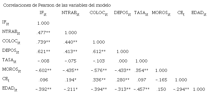 La Tabla 4 muestra las correlaciones de Pearson para las variables que intervienen en el modelo. Como se puede observar la relación que existe entre los ingresos financieros y las colocaciones y depósitos de las CMAC es positiva y significativa (0,739 y 0,621 respectivamente), esto quiere decir que las colocaciones y los depósitos influyen en la generación de ingresos financieros. Las colocaciones a través de los intereses que se generan por los mismos y los depósitos porque son la fuente de fondeo más importante para generar recursos para colocarse. Por otra parte, los ingresos financieros se relacionan de manera negativa y significativa con la morosidad y con la edad de las CMAC (-0,602 y -0,392 respectivamente).