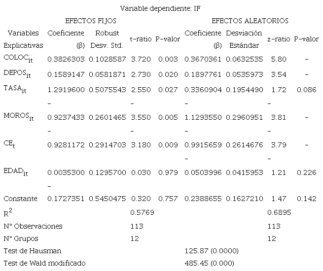 La Tabla 6muestra los resultados de la estimación del modelo 1 planteado en la ecuación (3) tomando como variable dependiente los IF, tanto para efectos fijos como para los efectos aleatorios. El test de Hausman muestra si los estimadores de efectos fijos y efectos aleatorios difieren o no sustancialmente. Los resultados de esta prueba muestran que la diferencia entre los coeficientes de efectos aleatorios y fijos es sistemática, por lo tanto, es mejor utilizar el modelo de efectos fijos. Por otra parte, el test de Wald modificado indica que la varianza de los errores de cada unidad transversal no es constante, por lo que existen problemas de heterocedasticidad. Para corregir este problema se ha utilizado los errores estándar robustos que permite realizar estimaciones considerando la presencia heterocedasticidad en el modelo.