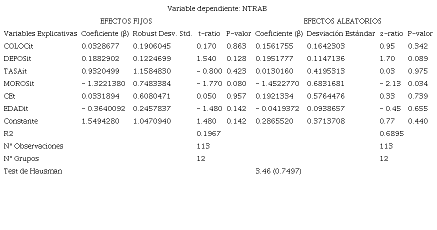 La Tabla 7 muestra los resultados de la estimación del modelo 2 planteado en la ecuación (3) tomando como variable dependiente el NTRAB, tanto para efectos fijos como para los efectos aleatorios. Los resultados del test de Hausman muestran que la diferencia entre los coeficientes de efectos aleatorios y fijos no es sistemática, por lo tanto, es mejor utilizar el modelo de efectos aleatorios. Los resultados de los coeficientes de los efectos aleatorios se presentan corregidos para evitar la heterocedasticidad del modelo.