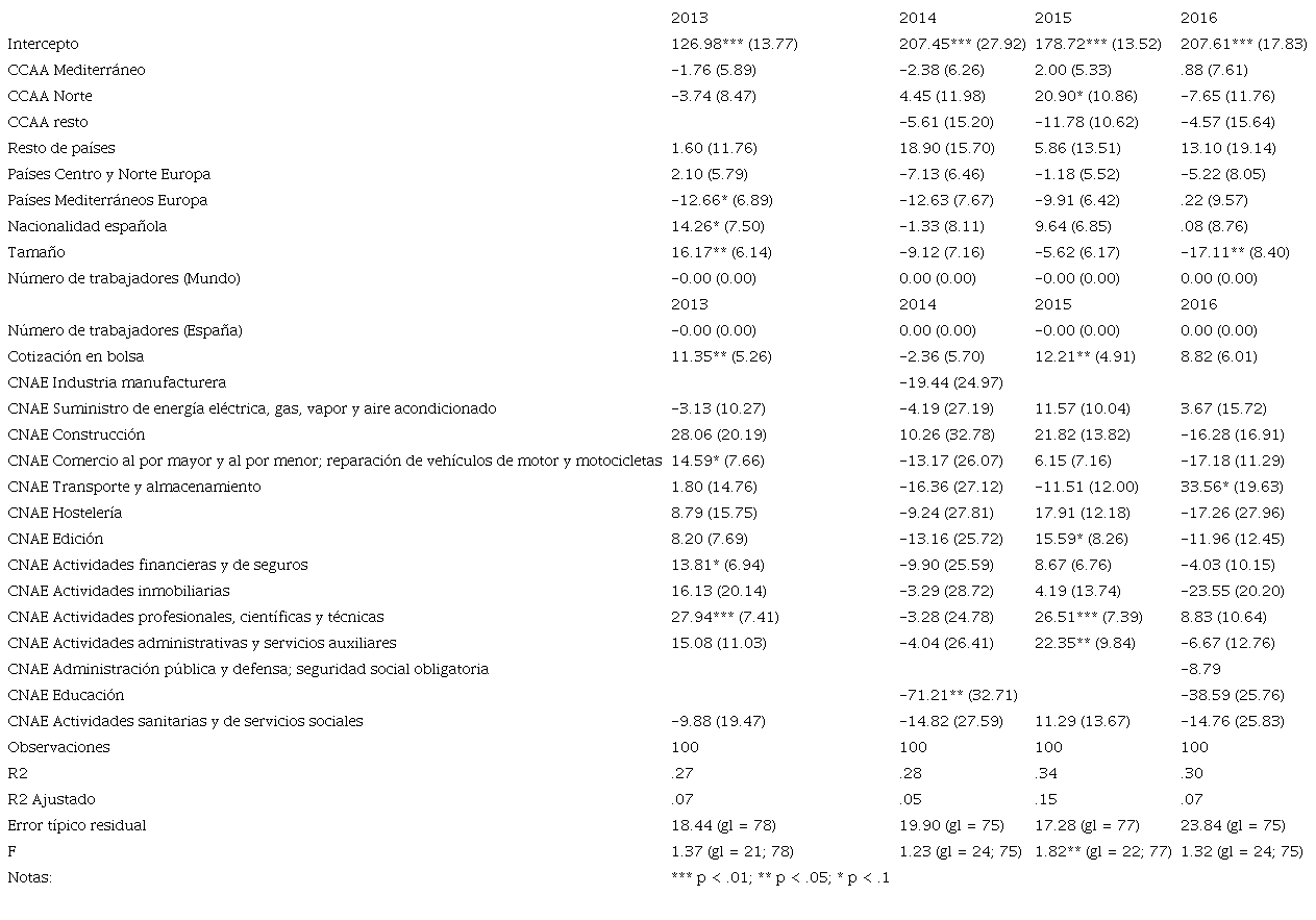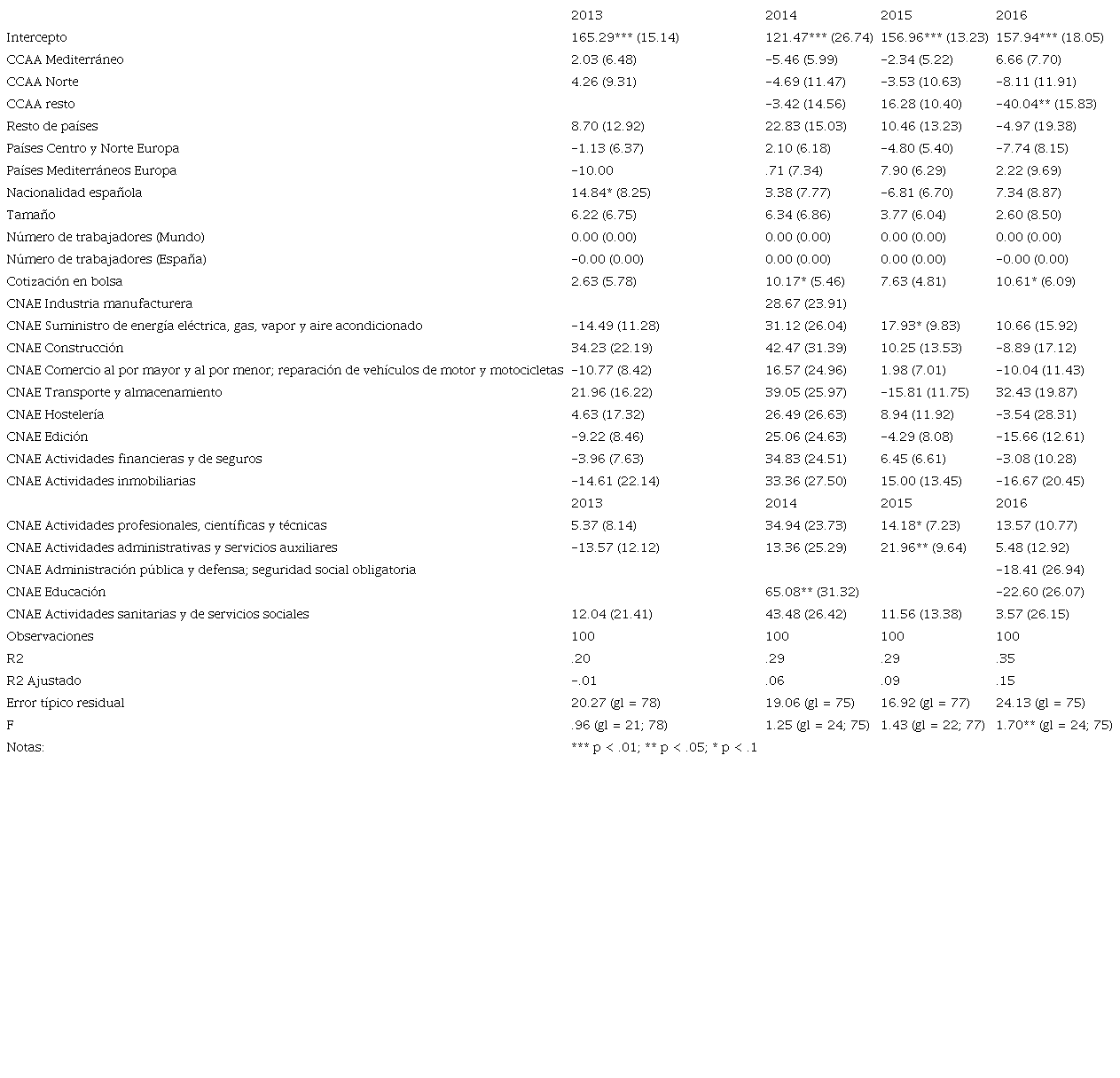 Al margen de la significación estadística de las variables, se detectan ciertas pautas o tendencias que en una investigación más sistemática cabría desentrañar. Por ejemplo, si se atiende al signo de los coeficientes, en tres de los modelos, la pertenencia de las empresas tanto al área geo-cultural mediterránea (2014, 2015 y 2016) como al área del resto de países (2013, 2014 y 2015) parece aumentar su puntuación respecto a las empresas del área anglosajona, mientras que su pertenencia al área del Centro y Norte de Europa parece contribuir a reducir la valoración de las empresas (2013, 2015 y 2016).