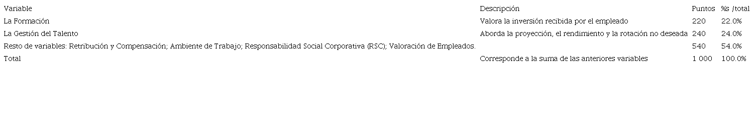 La elaboración del ranking de las 100 empresas más atractivas para el desempeño laboral en España se efectúa a través de seis variables independientes y una dependiente (tabla 1), cuya ponderación potencial varía según la variable en cuestión y puede alcanzar un máximo de 1.000 puntos. El estudio se centra en dos de las variables independientes: Formación y Gestión del Talento, por estar vinculadas de forma directa al conocimiento. Además, son las más relevantes desde un punto de vista cuantitativo pues alcanzan un valor potencial del 46% de la variable dependiente total del valor.