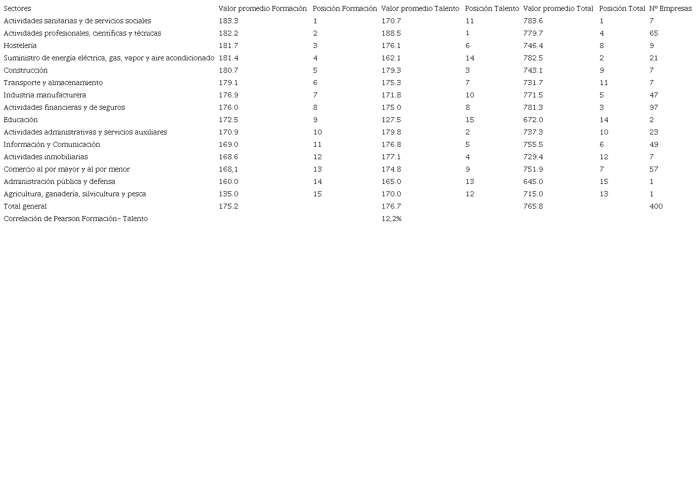 En la tabla 2 se puede apreciar el valor de la formación de las empresas clasificadas por sectores económicos. La primera posición es ocupada por las actividades sanitarias y servicios sociales, las cuales alcanzan una valoración promedio de 183.3 puntos. En segunda posición se sitúan las actividades profesionales, científicas y técnicas con 182,2 puntos y donde se encuentran empresas de consultoría internacional como Deloitte, PWC o KPMG. Destacar que un sector tan relacionado con el conocimiento como el de la educación se sitúe en novena posición con poca representatividad en el número de empresas.