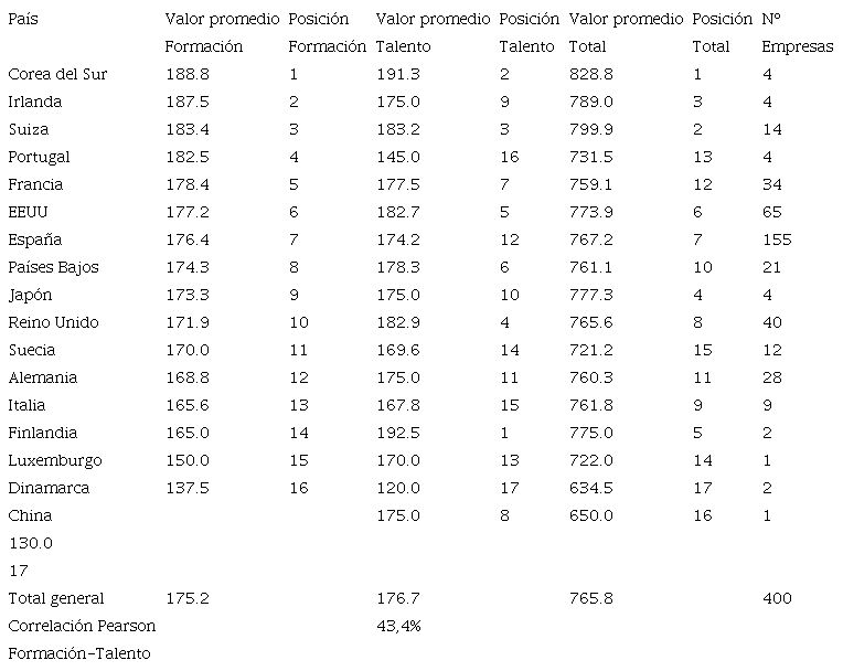 En cuanto a la valoración del talento destacan las empresas de Finlandia y Corea del Sur, aunque ambos países carentes de representatividad en el número de empresas. En tercer lugar, se sitúan las suizas, con una puntuación muy similar a la obtenida en el análisis de la Formación 183.2 puntos. Las empresas del Reino Unido con una baja valoración en el promedio de Formación obtienen la cuarta posición en Gestión del Talento. En el caso de España, destaca el hecho de que pasa de la séptima posición en Formación a la duodécima en Gestión del Talento, lo que revela que ambos factores no siempre van en la misma dirección o que, el tratamiento del capital humano en ocasiones no es el debido. También cabe destacar que las empresas de procedencia portuguesa son de las más valoradas en cuanto a Formación (cuarto puesto) y sin embargo, a la hora de analizar el Talento y la valoración total resultan de las peor consideradas, pues ocupan la posición decimosexta y decimotercera, respectivamente. Esto explica que la correlación entre la Formación y Talento agrupada por países sea del 43.4%.