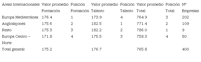 En el análisis por áreas internacionales, recogido en la tabla 4, las empresas de Europa Mediterránea ocupan el primer lugar en Formación y el último en Gestión del Talento, lo que de nuevo muestra la baja correlación entre ambas variables. Otro aspecto destacable es la baja valoración de las empresas de Europa Centro Norte, con países como Dinamarca, Luxemburgo, Finlandia o Suecia. Las empresas de los países anglosajones son las que mantienen posiciones más constantes.