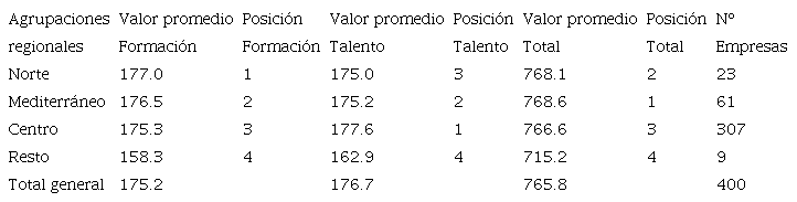 En la tabla 6 se pueden ver los valores promedios de la Formación y de la Gestión del Talento por áreas regionales en España, en la que apenas existen diferencias entre zonas, sin tener en cuenta la agrupación el “Resto” que ocupa la última posición y representa el menor número de casos. En cuanto al número de empresas, si se aprecia que predominan las empresas ubicadas en la zona centro de España, concretamente en Madrid que es la capital del país.